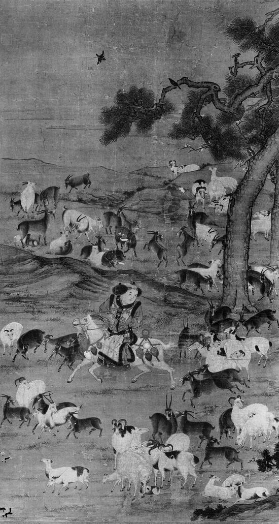 与北京画院藏《三阳开泰图》有关联的另一件台北“故宫博物院”藏《宋人九阳消寒图》,也是值得研究的一幅画作。《宋人九阳消寒图》,绢本设色,纵141.3厘米,横77.4厘米,石渠宝笈续编乾清宫著录,鉴藏宝玺为“八玺全”“嘉庆御览之宝”“宣统御览之宝”。画面中的骑羊童子与北京画院藏《三阳开泰图》上的骑羊童子之坐姿、穿着、配饰等完全一致,几如复制一般。《宋人九阳消寒图》画中的骑羊童子身着的皮毛比甲上,有描绘清晰的金线花纹,而童子的比甲均属于银鼠黑貂尾材质,这样的衣着材质,与台北“故宫博物院”藏元代刘贯道画《元世祖出猎图》中的元世祖身穿银鼠黑貂尾皮毛大氅材质一致,则可推测类似如此穿着,当来源于元代蒙古皇族或贵族。另《宋人九阳消寒图》中骑羊童子的面部描绘,完全采用了立体式的表现方式,确切地说,就是西洋画法。这样一幅极具中国节令特色绘画中的主角,用西洋画法描绘面部,以决然区分于其他用传统中国画勾线方式,所表现的骑羊童子的清秀眉目。《宋人九阳消寒图》画面中的童子面部处理方式应出自宫廷洋画家,或与郎世宁西洋绘画方式相类似的其他清宫画家之手。再论《宋人九阳消寒图》中的众多羊,凡黑色者其鬃毛的描绘,可以找到立体式的影子,这也是在大多与骑羊童子有关的古代画作中所不曾见到的。于此再提郎世宁,他在清宫中曾绘制过清宫节令画,据故宫博物院畏冬先生统计,郎世宁之代表性节令画21幅,其中包含一幅“年画”《开泰图轴》,绘三羊于树下,乾隆御题“开泰图”三字。而北京画院藏《三阳开泰图》右下角一黑一白两只羊,其形象可视为来源于《宋人九阳消寒图》画幅右下四羊一组图像中的两只。就表现方式而言,虽不及《宋人九阳消寒图》中黑色鬃毛羊立体化鲜明,但北京画院藏《三阳开泰图》中的两只羊也着力体现了其透视感和动物质感。