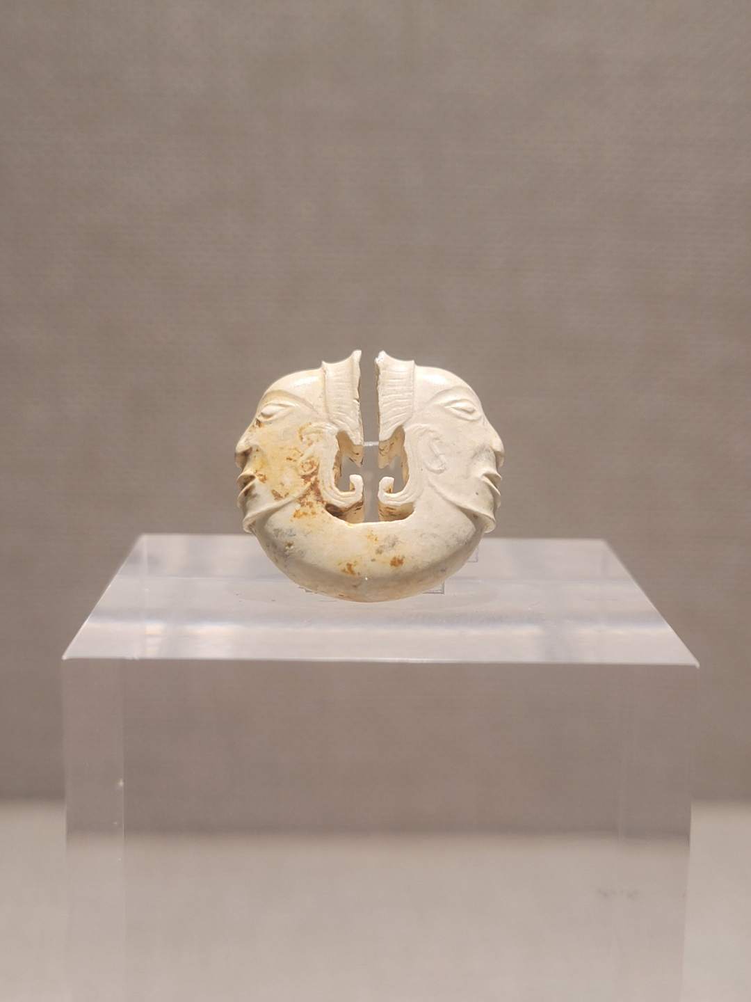 此次展出的“连体双人头像”即为石家河遗址谭家岭出土,为双人首共一蛇身形象,人首皆戴头冠,耳部饰S形简化蛇,该玉玦是石家河先民对蕴含通天通神能量的某种信仰的体现,也是人首蛇身传说的最早实物证据。