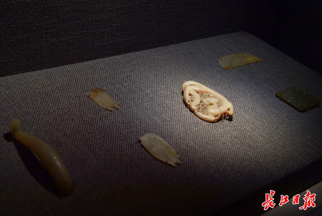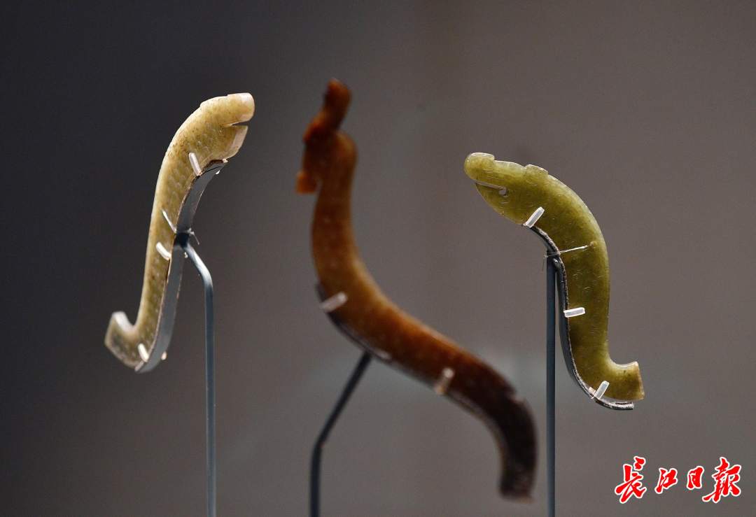 楚国玉器中的佩玉以其独特的文化审美和高超的制玉工艺受到世人瞩目。在东周楚国玉器中,最具有特色的是龙形玉佩。此次展出的荆州博物馆藏“无足玉龙佩”为国家一级文物。龙是中华民族的图腾,是古代帝王国君的象征。龙形玉佩最早出现于春秋晚期,流行于战国时期。楚国的龙形玉器纹样造型奔腾张扬,与中原地区的龙形玉器纹样造型相比,其更富有张力也更具有浪漫主义情怀。