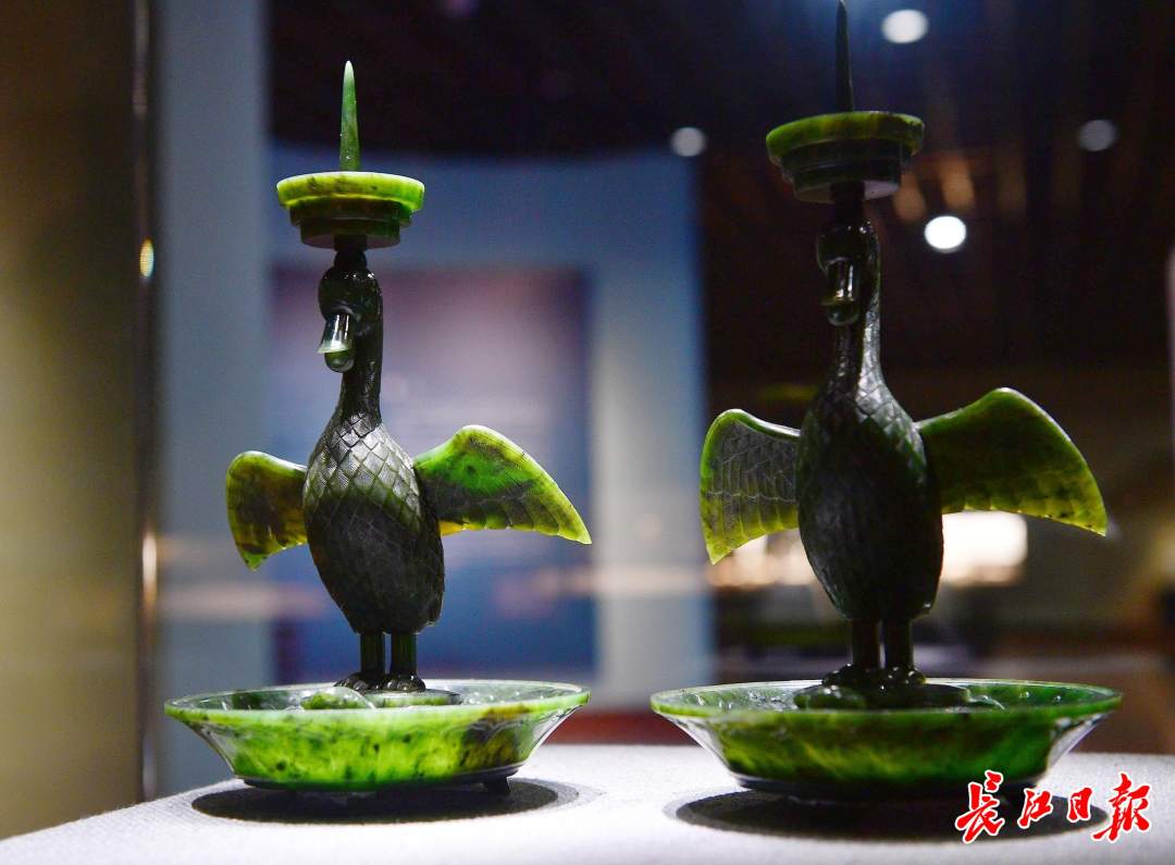 此次展品中的清碧玉“海晏河清”烛台、清乾隆款青玉双凤交颈壶、白玉福寿纹葫芦形壶等,则均有吉祥美好的寓意。