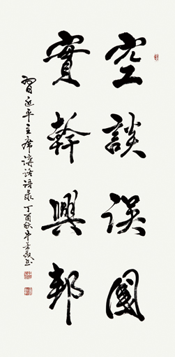 凭借深醇的涵养,专注的研习,牛芳茂先生在严谨而稳健中不断探索着承古之继,亦在与时俱进中追求着化变之新。其笔墨彰显出酣畅意足,跳宕奔突之磅礴气势。其字势之欹侧险劲、姿态多变、遒劲姿媚、纵敛自如,呈现出蓬勃的艺术生命力,形成鲜明的“牛氏书风”。