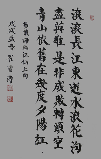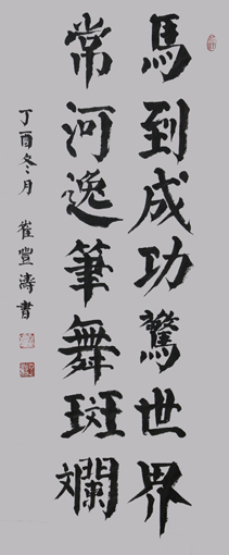 上初中时就对书法及美术有着浓厚的兴趣,在别的孩子戏闹顽皮时他却在练习书法,写生创意,临摹柳体、颜体已成了少时生活的一部分。2014年有幸结识了中国当代书画界泰斗张家雁老师,在张老师的指导教诲下书法有了很大的提高,崔丰涛每个星期都要到老师家中勤学苦练,恩师手把手一个字一个字从楷书基础练起,包括站姿,执笔都从学习古人开始,严格要求,老师说字如其人,人格做好,字必写的好。