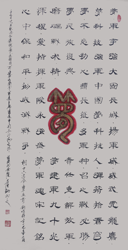 前期战斗任务完成后部队休整老兵退伍。还乡后政府要人协助工作,经党委研究 县公安局政审考核,进入派出所协助工作一干就是三十八年直到退休。在此期间利用工作之余,休息日、节假日操笔练习,由此、真、草、隶、篆、行五种字体都有造就,是有较深之功底。