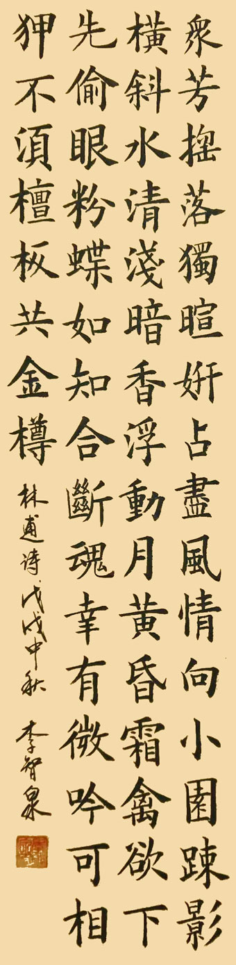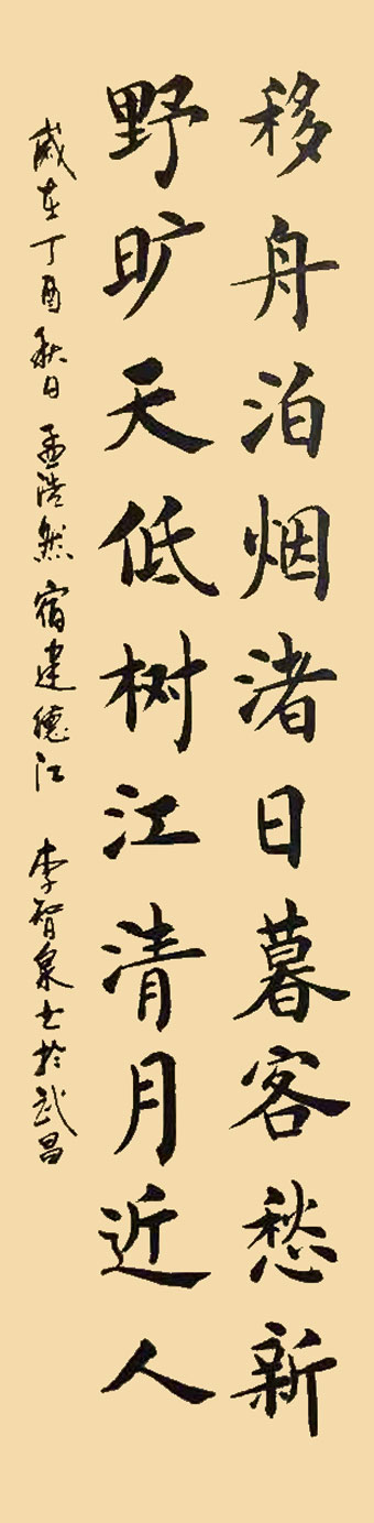 李智泉,1962年生于河南光州,字墨之韵,号江淮墨客。现为中国楹联学会会员,中国教育电视台《水墨丹青栏目》《名家讲堂》签约艺术家、中国世纪大采风书画院院士兼副院长,国家一级书画师,中国民族建筑研究会书画艺术专业委员会理事、客座教授,头条认证、火里小视频认证书法师。毕业于解放军艺术学院。自幼聪颖善学,拜名师数位,勤学苦练书法与绘画,先后在上海、信阳、温州从事书画工作。2008年以后,在武汉市洪山区华中师范大学家属区做书画培训至今,兼书城路社区文化空间书画指导老师。