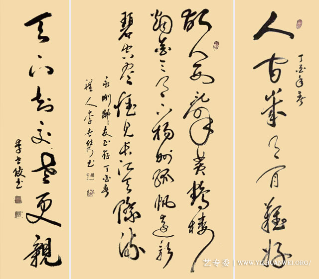 他写字从来从不讲排场,宣纸放在地上或挂在墙上他都可以挥洒自如,妙手天成。只要兴趣来了,随性而作,一挥而就。他的口头禅就是,书法的确是个高雅的艺术,但是并不是只有坐在高雅的写字楼里才能写出好作品。