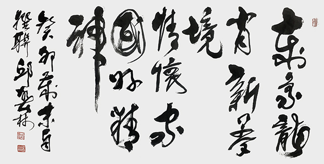 其书法少临父帖,兼习诸家,博采众长,兼收并蓄,师法自然,融会贯通,自成一体。近十多年相继在国家政协礼堂、北京展览馆、民族文化宫、相关国家大使馆和中名联驻创基地多次展览,并先后被推荐到约三十个国家及其台湾、港澳地区进行文化艺术交流。在《中国收藏》、《世界知识画报》等十多家专刊以及全国上百家媒体报道。尤有《人民美术报》发表多版幅自吟诗联书法作品专版献礼全国两会。2016年台湾政要收藏其书法作品《两岸一家亲》《深化和平发展 造福两岸民众》,并分别致以感谢状。 2019年有作品《沁园春雪》被刚果女王收藏,庚子初夏获得中国书法家协会苏士澍主席亲笔书写给于其《爱国艺术家》殊荣。近年有黄金版书法作品自吟诗《觅》被荣耀登上百度百科并入选中韩书画艺术展。邱春林作家视频和邱春林艺术家影响力书法采访视频等分别在腾讯网、搜狐、土豆网等各相关媒体播出。