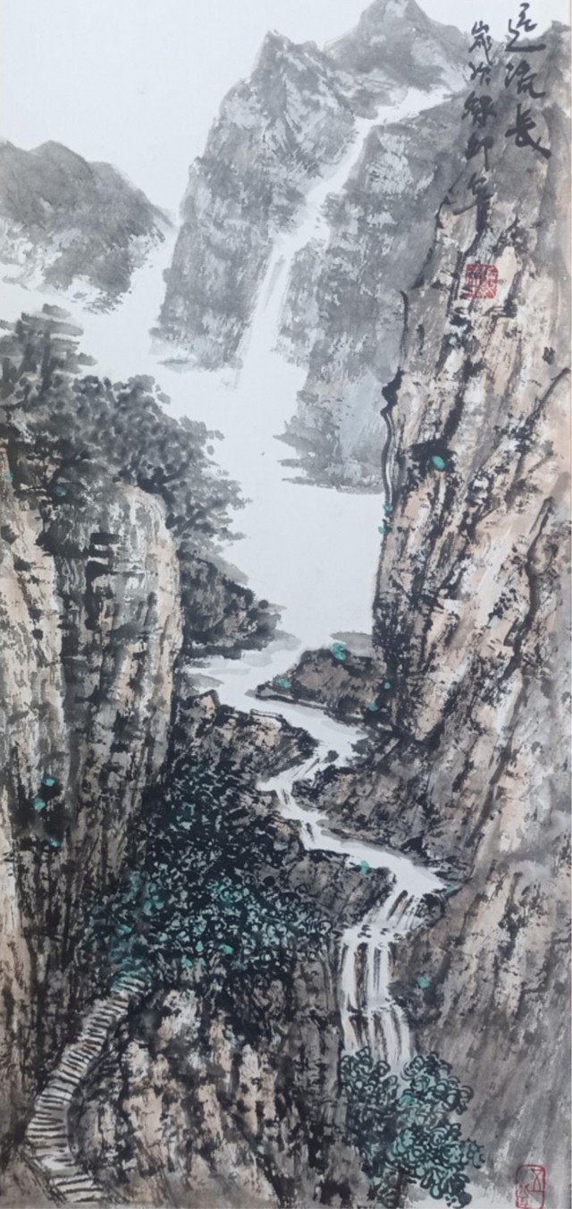 其山水画作品用笔讲究、线条疏秀流暢、刚柔相济、变化无穷,作品人物、花卉、雕塑亦独创一格。作品荣获第一届“中华杯”全国书画家作品邀请赛获银奖,作品入藉于《中国书画家大典》《中华书画艺术博览全书》等。纵观当代著名画家任纪成先生的山水创作,恰是法修高门得授心诀,文化修为博观厚积之后的正宗气象。他在师古、师今、师造化的山水透悟中,形成了笔墨沉稳,皴法机变,筋骨气韵双佳的创作风格,成为山水龙脉传承的时代典范。