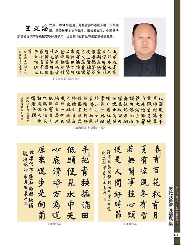 王义海,汉族,1964 年出生于河北省邯郸市肥乡区,本科学历,曾受教于刘文华先生、洪铁军先生,华夏国艺(北京)书画艺术中心副秘书长,任邯郸市作家协会书画院副秘书长,中国书法家协会培训中心钱松君导师班学员,任邯郸市肥乡区书法家协会副主席。