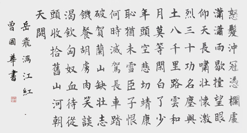 曾国华,1951年出生,湖南娄底人,中国当代书法艺术名家,中国书画学会名誉主席等。楷隶行草篆皆研,且独具个性。曾获中国传统文化创作终身成就最高荣誉奖、中国文艺泰斗终身成就奖、中国民族文艺领袖奖终身成就奖、世界华人文艺先锋奖金奖、中国红色艺术创作最高成就奖金奖、中国传统文化最高成就奖、当选2014中英艺术交流形象大使、中华传统文化杰出传承人等。