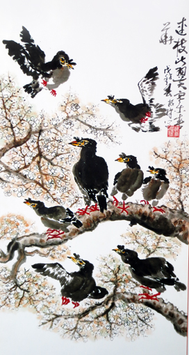 胡振汉先生作品用重彩勾染表现花朵或树叶,兼以花虫点缀的细腻,在纯熟中又显新奇隽秀,线条流畅有力,色彩柔润澄净;从布局来论,可以看出是经过一番苦心孤诣、别具匠心的经营、思考、组织与安排的。其画作题材丰富多彩,有鸟栖细枝之悠然,有一隅树石之雅致,有果实累累之繁茂等等。都在虚实相生,动静相宜间栩栩如生。如有花树之处,大都衬以飞鸟栖息,对飞鸟形神的勾勒可谓生动,或凝目,或远眺,时而休眠,时而振翅,使鸟儿之灵动与自然之宁谧相呼相应;若只写花叶,则必有清风吹掠,或以飞虫点动。他的作品,总会在宜动宜静中臻显出画面张力而创造出更为生动,致远的意境。