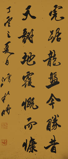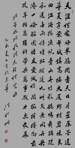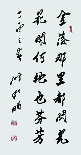 竖幅行书作品笔法精致,用笔细腻,结构多变,增损古法,书体美轮美奂;行笔快速不失法度,中锋刚劲不失大方,彰显其技巧和水平更高一筹。凌厉洒脱的笔韵,静逸空远的情操,作品显示出刚健挺拔、富有朝气的美。潘新明笔下的一个个字,像悦动的精灵,在纸上跳跃,开而不羁,收而不紧,收放自如,疏密缓骤,跌宕起伏。这两幅佳作令人耳目簇新,气爽神清,掀起人内心无数涟漪。在一笔一笔的千锤百炼中,潘新明体味着艺术生命的历练,希望的坚守,精神的升华。他用笔精到、独具匠心,形成了自己的独特风格,他的每一幅字都堪称精品。出版有《周恩来手迹大字典》《潘新明韵语选集》等。
