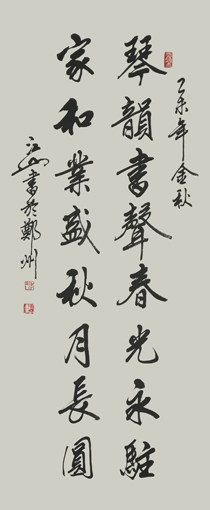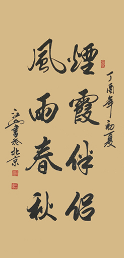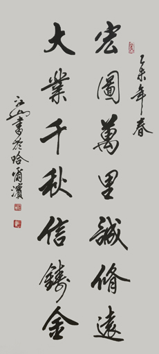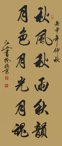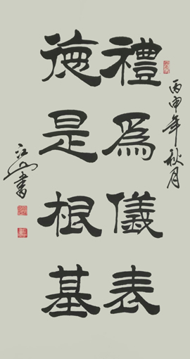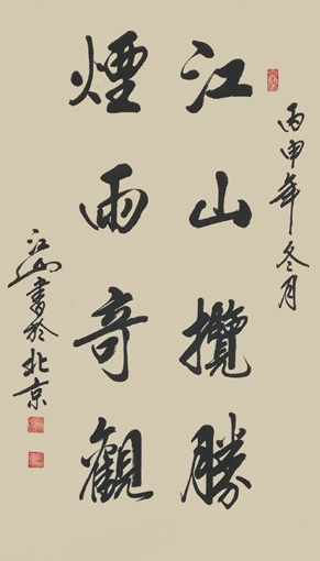 江山先生自幼酷爱文学书法,曾拜全国著名书法家王梦赓先生为师,扎实研练,默默耕耘。2005年以来尤其以书写冠名联见长,曾为包括国家领导人在内的社会各界人士书写冠名联七千余幅。江山书法秀美飘逸,雅俗共赏,多次参加全国书法大赛并屡获大奖。其中《沁园春·雪》,苏东坡词《念奴娇·赤壁怀古》等大幅行书作品,曾作为国礼赠送给韩国日本贵宾。部分作品已被欧阳询纪念馆,苏东坡纪念馆,李可染故居,中国盛世收藏拍卖公司,中国航空公司,中国集邮总公司等多家单位收藏。