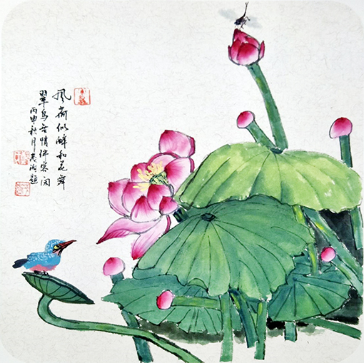 郑茂海作品《风荷似醉和花舞、翠鸟无情伴客闲》规格:50cmx50cm