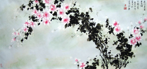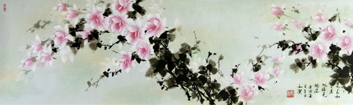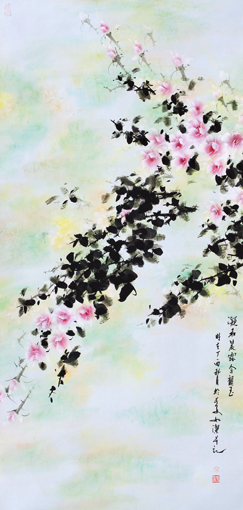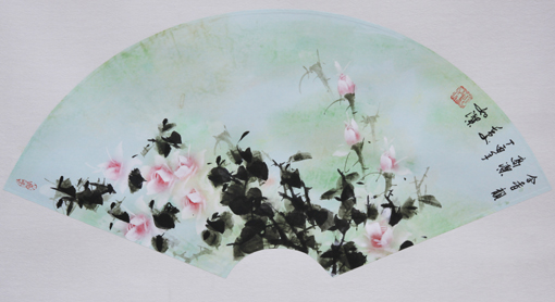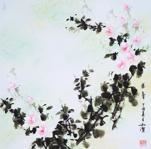 素雅是如洁月季最准确的表达方式,他画月季,写意中重于工笔,绿意点缀其间,常绿或是半绿,枝叶层层叠叠,齐齐整整,呈羽状式,阔片式,叶是点点而到,小而精密,花多为半开或开放了的,红色、粉红色、又有近白色的,略带黄白色的,往往是柔柔的,润润的,艳艳的,形式多样,各领风骚。如洁创作的态度,决定了他月季作品的高度,花、叶、枝、茎一脉相承,多处繁严,少处简洁,一叶多叶交错,一花多花交织,当得玲珑满目,肃然而敬。特别是如洁用皮纸作画,且独创“湿画法”,又是别有一番情趣。诚心诚意,真诚真实,自觉的艺术感悟和自我的创作激情,让如洁的月季深入到了人民大众之间,接地气彰能量,为素雅的高格画上圆满的句号。