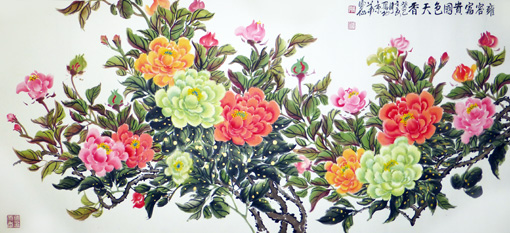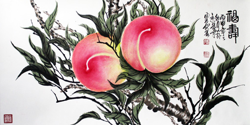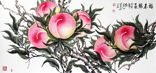 刘凤仙创作,意存笔先,画尽意在,豪放不显张扬,意境深远而不失恬淡清新,其梅花或艳如朝霞或白似瑞雪;寿桃或娇艳欲滴或灵秀芬芳,阵阵暗香仿佛跃出纸面,扑面而来,巧妙的将自然灵性点染画中,好似呼唤出了中国千年文化底蕴的深沉回声,诠释了中华民族古老艺术的深刻内涵。
