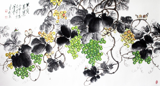 绘画作品中的诗文跋语往往代表作品主人的心声。一句好诗,能表现出作者的内涵和学养。一句好诗,亦能起到画龙点睛的作用。刘凤仙作品中的诗句布局巧妙,胸怀天地,在构图上,突出主体,讲求布局中的虚实对比与顾盼呼应,把发挥画意的诗歌题句,用与画风相协调的书法在适当的位置书写出来,辅以印章,成为一种以画为主的综合性书画艺术作品,留白空间的疏、密、聚、散;花、果、鸟、叶的柔嫩灵活,老干边缘的毛、涩质感,无不显示其作品的巧夺天工。