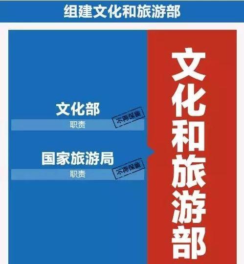 提请审议的国务院机构改革方案提出,组建文化和旅游部。为增强和彰显文化自信,统筹文化事业、文化产业发展和旅游资源开发,提高国家文化软实力和中华文化影响力,推动文化事业、文化产业和旅游业融合发展,方案提出,将文化部、国家旅游局的职责整合,组建文化和旅游部,作为国务院组成部门。其主要职责是,贯彻落实党的宣传文化工作方针政策,研究拟订文化和旅游工作政策措施,统筹规划文化事业、文化产业、旅游业发展,深入实施文化惠民工程,组织实施文化资源普查、挖掘和保护工作,维护各类文化市场包括旅游市场秩序,加强对外文化交流,推动中华文化走出去等。不再保留文化部、国家旅游局。