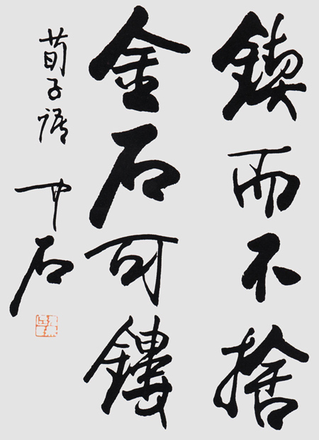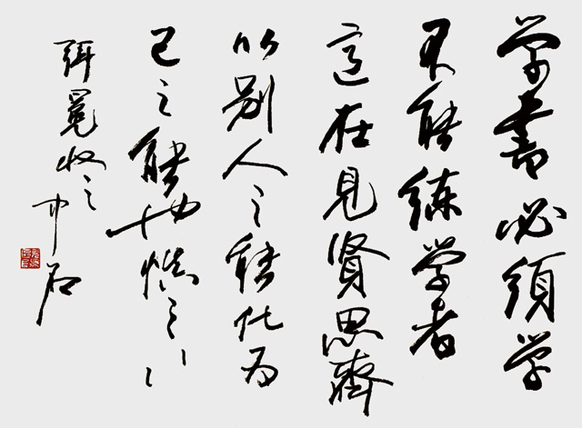 先后师从武岩法师和吴玉如先生,其书法各体兼通,而汇综到行草书,以东晋书风为宗,博采周金汗石、碑刻法帖之长,形成飘逸而沉稳、刚健而温润、灵动而厚重的艺术风格。代表性作品出版有《中石夜读同钞》《中石钞读清照词》《老子道德经书卷》(小楷)《朱子治家格言》(楷书)《欧阳中石书古文辞》《道德经》(章草)等。欧阳中石具有深厚的国学功底,在逻辑、音韵、戏剧、书学、语文教育学专门领域有很高的造诣,其主要著作《中国逻辑史》《中国逻辑思想史教程》《书法与中国文化》《中国书法史鉴》《书法教程》《书法教学参考资料》《中国的书法》《章草便检》《学书津梁丛书》(六册)《章草字典》等,在有关学科领域都有很重要的影响。