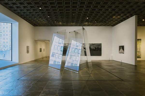 展览现场里希特玻璃雕塑作品立于1960年代的黑白摄影作品之中
