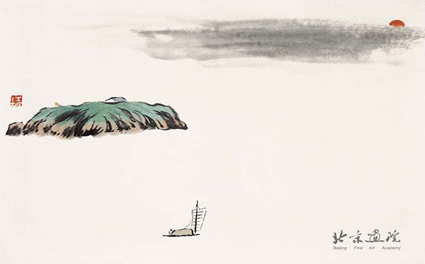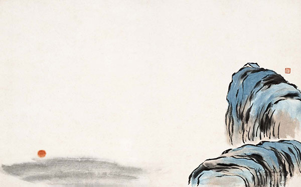 白石老人的山水画创作构图奇简,没有复杂的皴擦点染,也没有平铺细抹的死功夫。用笔简洁凝重、用色明艳单纯,于拙处可见真意,于简处能现画境——令人赏之回味无穷。