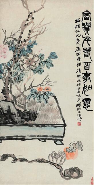 今天的中国画习惯分为人物、山水、花鸟三科,那岁朝图毫无疑问应归入花鸟画的范畴(事实上,所谓“花鸟画”是三科中题材最为庞杂的一科,一如书画幅制中的“扇面”——矩形之外所有形状都可归入其中)。在我国传统绘画题材分类中“岁朝图”应在博古清供类。“清供”又称“清玩”,《辞源》解释为“清雅的供品”,“岁寒三友”、“四君子”、水仙、菖蒲、百合、丹柿、佛手、石榴等以及紫砂盆、水盂、胆瓶、金石、书画、古董、盆景、书卷、博古架等(各种材质的古代器物题材又称“博古”),只要“含有善颂善祷之意”(周瘦鹃《岁朝清供》),皆在其中。齐白石作岁朝图,常以鞭炮、茶壶入画,虽谈不上清供,却更贴近寻常百姓生活实况,以至于后来的王雪涛、郭味蕖等作岁朝图多有鞭炮出现,俨然成为“传统”了。