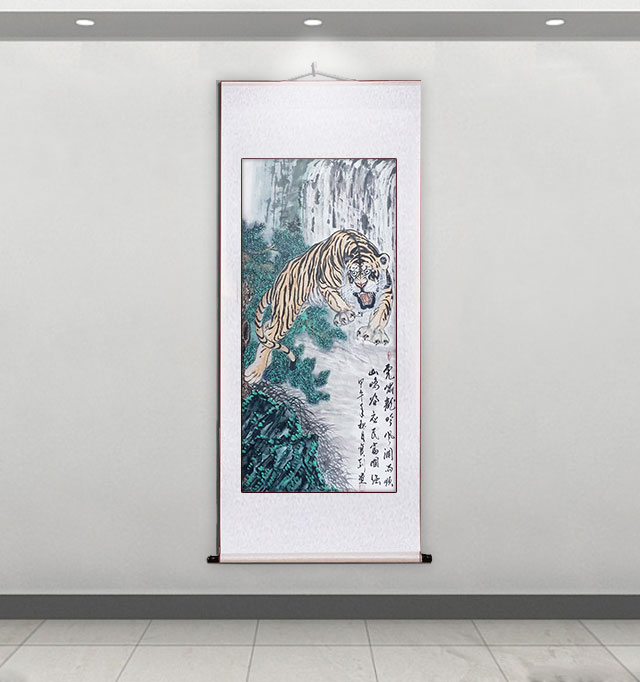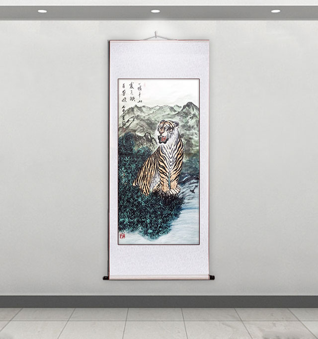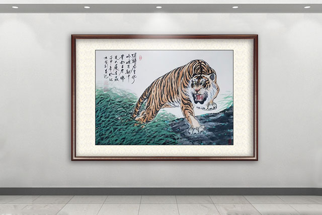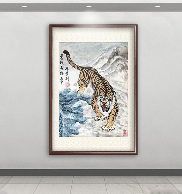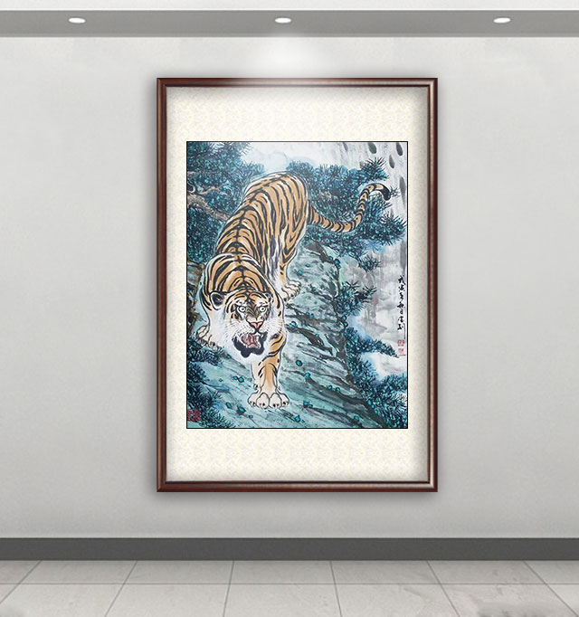 他的绘画题材相当广泛,山水、老虎、竹梅画得遂心应手,很有古典气韵,也有笔墨当随时代的建树。画老虎以纹谋骨,画得骨力雄强,可见啸天之威!动态与势态同时都有精彩的表现,这是他的老虎远观看有跳天门之威,近看有卧凤阙之神的重要原因。小写意可以笔笔相生,夺老虎之精神,也可以笔笔相映掠老虎之体貌,正是雅俗共赏的真功夫。如果老虎只作雅,难免画得风花雪月失了气势。如果老虎尽为悦目,难免画得会有烟火气。尽俗非妙,只雅非圣。徐宝刚最能拿捏住形态虎与神态虎的创作点位,所以起笔落笔可以举重若轻,把老虎画得形神兼备。特别是他又有极好的山水创作能力,虎以山作烘托,立骨传神,更显精气神。上山为王者,下山为勇者,文化内涵一目了然。