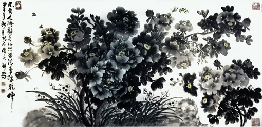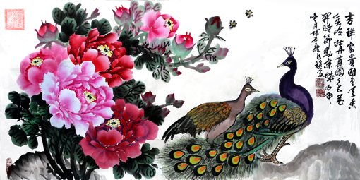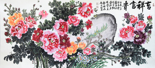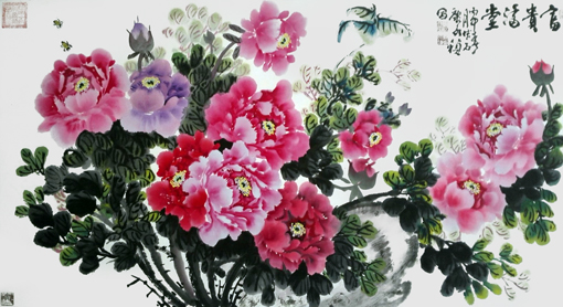 刘大为点评:其用笔挥洒自如,气韵贯通,气势磅礴,可谓感悟深刻,造诣高深,典雅大气的用笔,精美绝伦的构图,使牡丹的风采神韵跃然纸上,新颖独特,笔法严谨。画中的牡丹激情绽放,花繁叶茂,画工细腻,凸显出牡丹的立体感,赋色之巧极尽水墨之高雅,隽逸和虚灵,观之活色生香,却不落艳俗,是难得的国画精品。画工精美绝伦,有着极强的艺术观赏性,书法作品字韵既犹如从纸中生长出来,根基扎实不浮乱,又觉有林中隐士之飘然若仙的出尘脱俗,真正做到了雅俗共赏。非常具有投资和收藏价值。