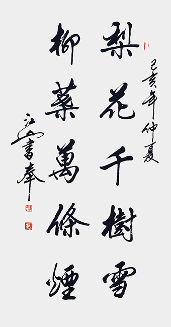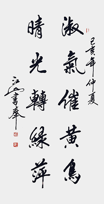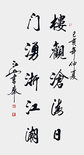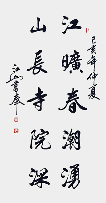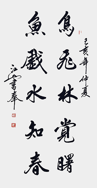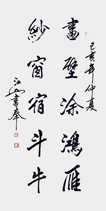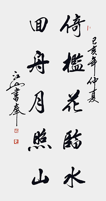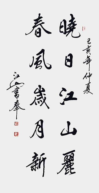 江山先生自幼酷爱文学书法,曾拜全国著名书法家王梦赓先生为师,扎实研练,默默耕耘。2005年以来尤其以书写冠名联见长,曾为社会各界人士书写冠名联七千余幅。江山书法秀美飘逸,雅俗共赏,多次参加全国书法大赛并屡获大奖。其中《沁园春·雪》,苏东坡词《念奴娇·赤壁怀古》等大幅行书作品,曾赠送给韩国日本贵宾。部分作品已被欧阳询纪念馆,苏东坡纪念馆,李可染故居,中国盛世收藏拍卖公司,中国航空公司,中国集邮总公司等多家单位收藏。
