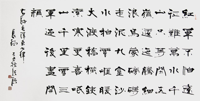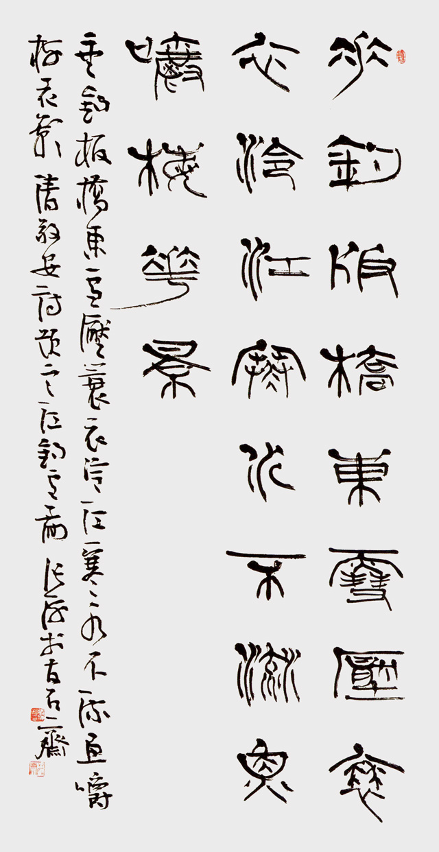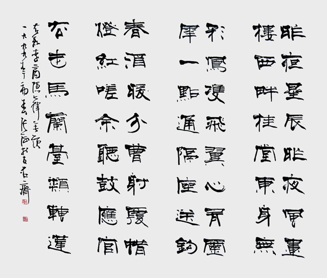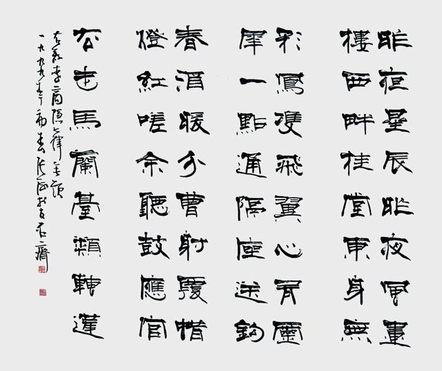 张海四体皆能,成果突出,具有强烈的创新精神,以隶书和行草最著。其隶书以汉碑为本,后潜心汉简,继而融合行草,最终自成一家,被书界称之为草隶。1987年即为日本专业刊物介绍,其行草书1992年获第五届书法篆刻展览全国奖。1990年以来陆续出版了《张海隶书两种》、《张海书法》、《张海新作选》、《张海书法精品选》、《张海书增广汉隶辨异歌》、《佳作解析—张海行草书苏辙黄州快哉亭记》等。沈鹏等书界权威对其为书为人的评价,收录在《创造力的实现》一书中。