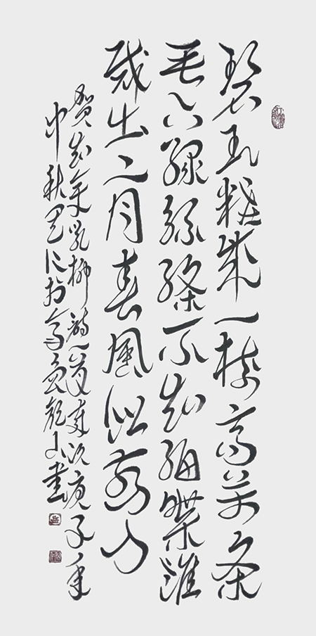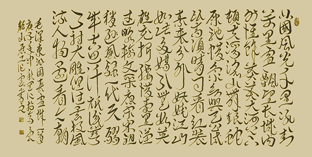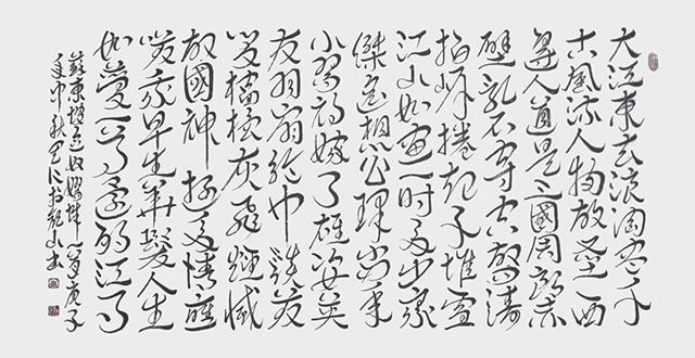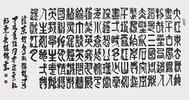 岳其仁之书法,兼擅多体,成就斐然,隶书、章草,尤为超迈。原中国书协主席、书法名家沈鹏先生评道:“岳其仁之隶书……如晨闻嘹亮的号角,战鼓连天,壮士临阵,披盔戴甲,慨当以慷,充满阳刚之气,让人振奋;又宛如山中曲折而下的溪涧,泉水叮咚,清脆悦耳,给人以遐想;又恰似荷塘月下,聆听远处缥缈的歌声,使人陶醉。”