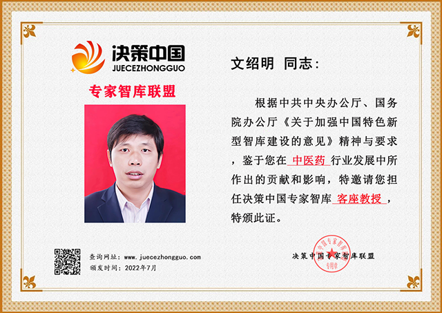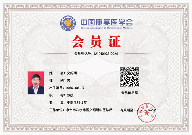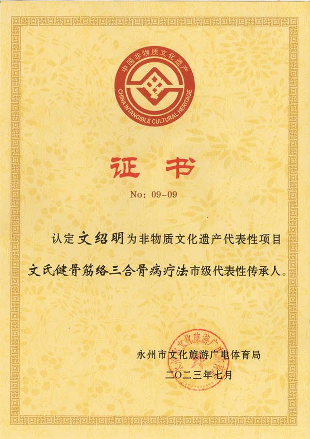 文绍明,1966年出生,湖南永州人,文氏中医世家第四代传承人,非物质文化遗产传承人,中医执业医师,医圣传人,国医大师李佃贵学术传承人。师承祖传,幼承庭训,遍览历代医著,精研传统中医名家医著,勤求古训,博采众方,尤擅临床实践,注重疗效,积累了丰富中医的理法方药和辩证施治的临床经验。
