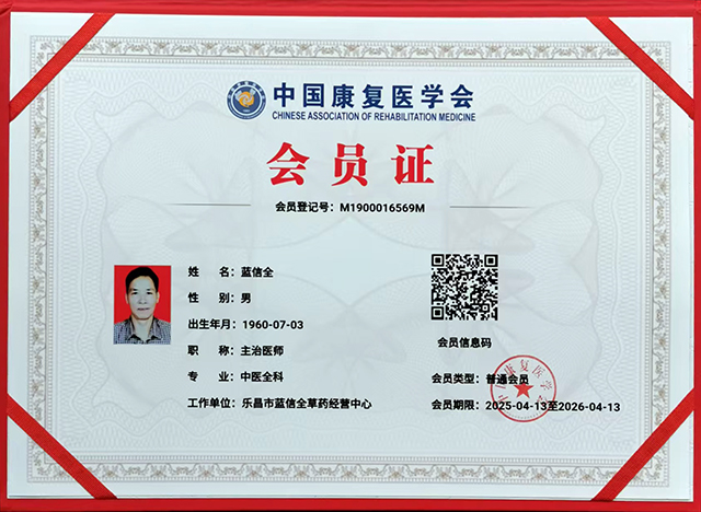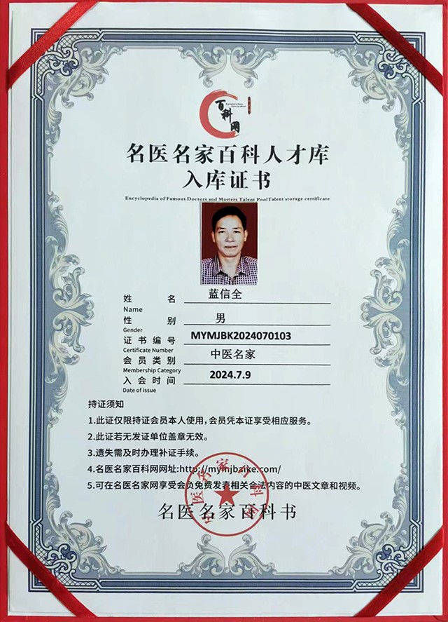 蓝信全,男,1960年7月出生,中国医药教育学会会员,现工作于乐昌市蓝信全草药店。个人对广西壮族蓝氏祖传药酒火罐闪火疗法有独到的研究。
