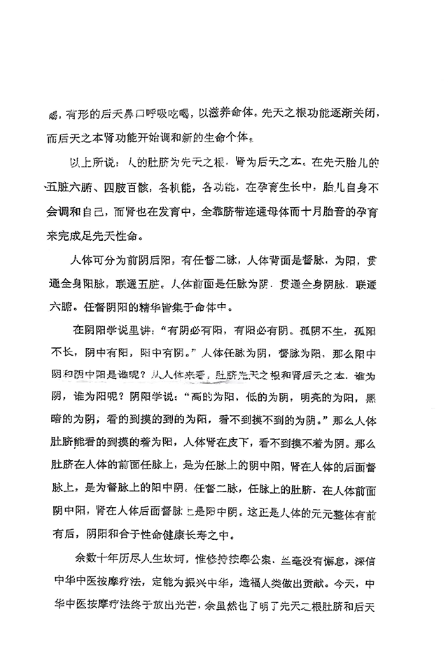 推、拿、压、揉、搓、滚、动、敲,这是传统文化里的八种手法为按摩。今天咱们说说按摩揉术,以揉为主的按摩揉术手法,按摩揉术手法是以修“命”(肉体生命),养“性”(思想、意识、感情、欲望、意念、思维等),而养“性”和合“命”的古老按揉原理而来。中华古方中医按摩揉术通过对人体按中有揉,揉中有按,揉中有摩,揉中有滚,滚中有揉,滚中有敲,敲中有揉,揉中有揉的揉术手法,对全身进行按摩揉术。人体是一个有机整体,从头到脚,四肢百骸,五脏六腑,各机能互生互化,同步运化,人体气血经络运化就像京广线,其中一个地方堵塞就会造成全线的混乱和失调。人体也是一样,只要一个机能或部位发生病变,就会影响到全身其他机能和功能的正常发挥。颈椎和头部是人体很重要的部位,是全身整体气血经络运行的必经之路。中华古方中医按摩揉术以颈椎、头部为主,全身调理,疏通体内十二经脉和身体内三百六十五条络脉,三千六百五十条支脉,揉推督脉,按揉任脉,和合中脉,和合体内奇经八脉,使经络疏通,营卫调和,气血周流如常,达到体内阴阳和合,恢复整体机能和功能,使体内气血畅通无阻,百病可祛除,并能使体内生发出新的能量,达到修“命”养“性”,而养“性”和合“命”的目的,是“性”“命”和合,是“长生不老”的中华古方中医按摩揉术疗法。