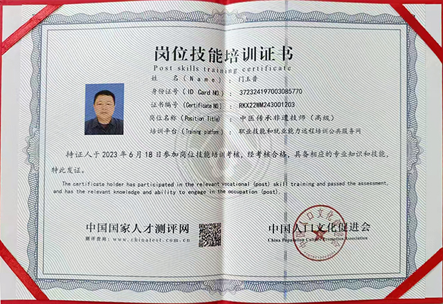 1944年6月22日,家父门福智出生,我家虽然行医,因行善行医,收入了了,家庭经济仍很贫困,人口众多,父亲等到9岁才入学读书,他学习努力,学业成绩非常优秀!并成了学校的学霸,台柱子!不几年奖状贴满墙壁,1961年正逢三年自然灾害,家中一贫如洗,吃饭成了问题,家里不得不让父亲早日毕业,就业,减轻家中的经济负担,为此读完无棣卫校,早己退学了,为此没登高门继续深造,失去了自已的大学梦,回家后,遵守先祖教训,重整旧业,办证成了一名乡村医生。几十年如一日,不管是风雨交加的夜晚,还是与家人团聚的年夜,随叫随到,从不怠慢,想群众所想,急群众所急,做群众所需,全心全意为人民服务。医治患者无数,有的困难户还分文不收,默默奉献。他从小亲身感爱家庭医德救人的家训教会,一生以医德扶伤着迷,真正实现了他的诺言,行医行善好修行,解人危难在福中,不作无良医生。为此在临终前握着我的手说:无论如何也要把这祖传秘方传下去,不管挣钱赔本,必须留住名声,为祖先争光,为家争荣!以实际行动叫我接手传承,老人的遗愿那敢违抗,老人带病手把手教会了制药看病。我接手后通过网络己传遍祖国大地!大江南北迎来各地患者,前来看病就医的络绎不绝!