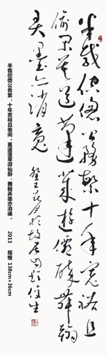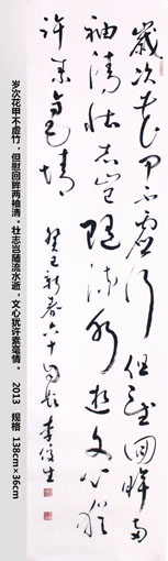 李俊生作品《岁次花甲不虚竹、但慰回眸两袖清、壮志岂随流水逝、文心犹许素毫情》2013 规格:138cmx36cm