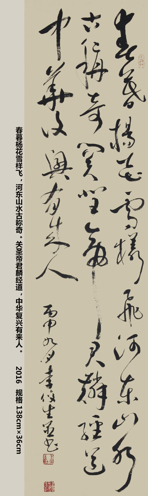 李俊生作品《春暮杨花雪样飞、河东山水古称奇、关圣帝君麟经道、中华复兴有来人》2016 规格:138cmx36cm
