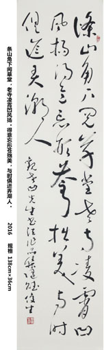 李俊生作品《条山角下阅草堂、老寺凌霄凹风扬、得意忘形苍拙美、与时俱进弄潮人》2016 规格:138cmx36cm