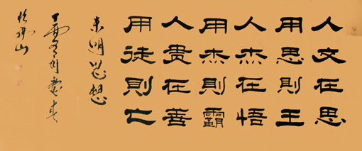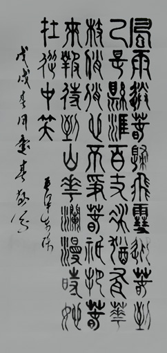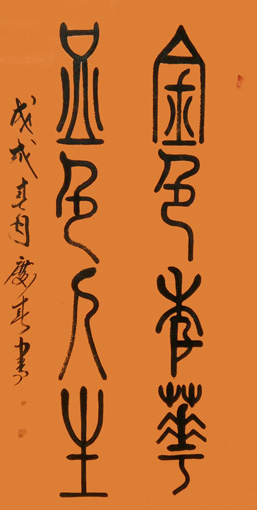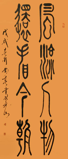 “书法艺术,美的享受,精神食粮,练就有成”,多年前写下的座右铭,阐释了书法艺术在其心中的重要性,并不断鞭策其刻苦钻研,勇攀书法艺术的高峰。通过多年的历练及创作,并将研究甲骨文、石鼓文、金文的感悟融入其中,赋予了篆书新的生命力,形成独有特色。至此,其作品以篆传神,贯穿时空,取法高古,意境神逸。