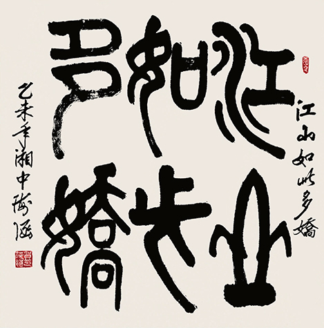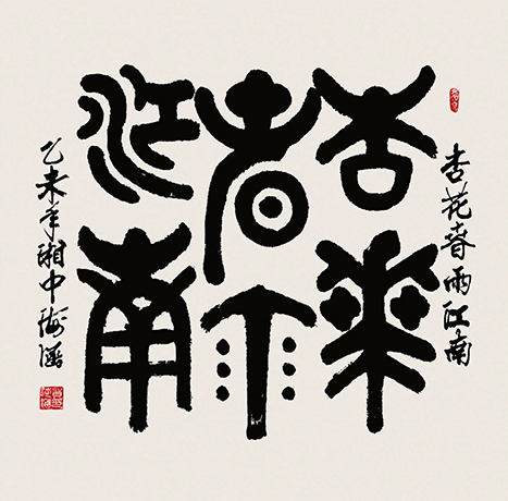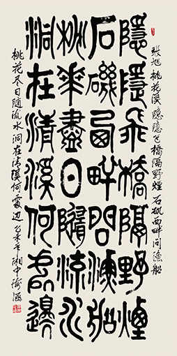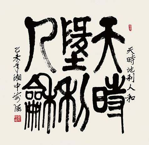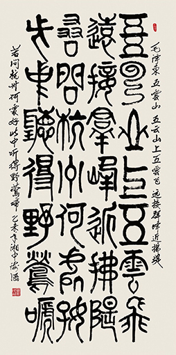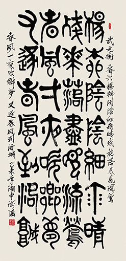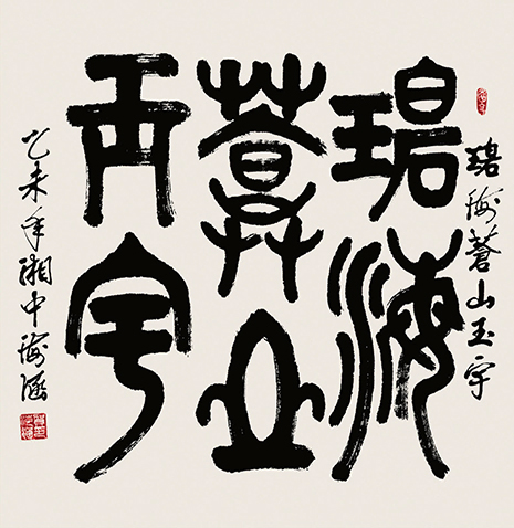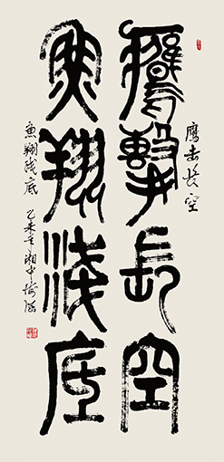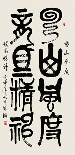 书法家贺海涵以篆书为擅,篆书渊源,发端亦早,品其作,大有“见笔墨则起矜庄”之气势。观其用笔,传承转换清晰,笔笔无碍,节奏感跃然纸上,枯润、虚实、疾徐皆互有对比,且未有板滞。又墨沉笔酣,飞白处显现出朴实,老辣的笔意,笔法讲究,一丝不苟,结体端庄。“篆尚婉而通”,在作品外形“婉”转中,内质笔势更达畅“通”。可谓于“笔势”中得见勃然生机。其书作简约、纯粹,大有“简而不空”,“真放在精微”的韵致。