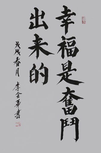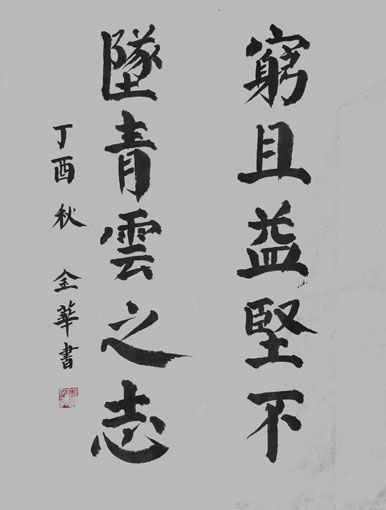 对于已有的成绩,李金华并不是沉浸其中,而是选择将其“忘记”,重新开始新的征程。而每一次创作,他都会有一种全新的,不一样的体会,这恐怕就是“忘记”带来的“澄怀”和“涤除”的心境效果之显现吧。李先生的笔墨之事是“一笔一精神、一字一世界”的修炼,不是去追求成名成家的功利心,而是在寻找一份安静、一份淡定、一份愉悦、一份幸福。再有,他希望书法这门艺术不仅仅只为自己娱情而作,更期待通过自己的勤谨和坚持为下一代,甚至几代人留下一些文化底蕴的财富,这正是一个艺术家所体现出的社会责任和价值追求。他说:“书法艺术永无止境,对我的艺术生涯而言,路,才刚刚起步,在对书法事业的追求道路上稳扎稳打,多和志同道合的朋友交流、取长补短、勤学勤练、用心感悟、用心书写,不断完善技法,提升自己的艺术修养和境界,为民族的书法艺术事业做点贡献!”