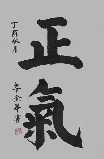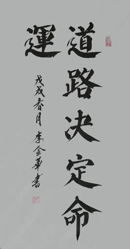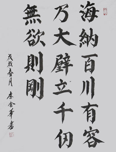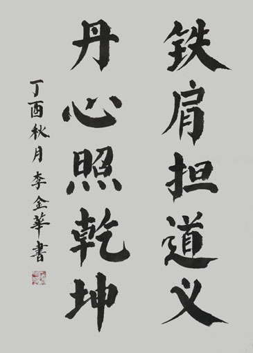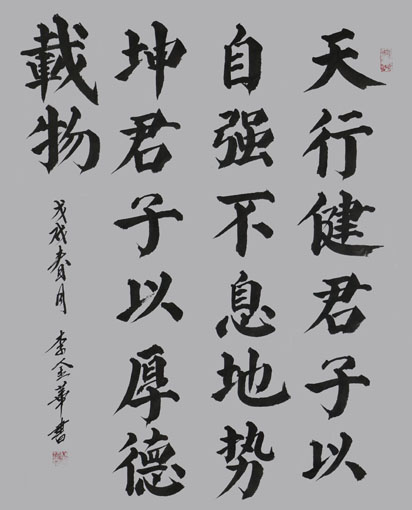 在李金华的人生修行中,他对自己是设有明确目标和实践步骤的。他将“修德”视为最先且最重要的功课,以德为本,对自己要有明确的“定位”,而后“践行”,方得“收获”,并在“感悟”中进一步提高和升华。观者若有心,便可感受到,李金华把自己的思想和践行都渗透到其作品的一笔一划中。他崇尚“颜体”,自然追摹颜真卿之笔意精神。观李金华先生书作,其作品里的厚、涩之美,“厚”来源于用笔的沉实气息之贯注,“涩”则得道于行笔过程也中力透纸背的看似生拙,实为老辣的功夫;作品中亦有一种宽、圆韵味,字中空间的松阔,横向伸展的结体,以及内紧外松的处理,弧形笔画的两侧裹束,造成圆浑、鼓突的“力涨”之势,内蕴特为深厚;朴、率韵致,也是李金华书法作品的又一特色,他以“意”驭笔,不作大起大落的刻意经营,以中锋笔法为本,取中正平直之挺拔,以侧锋笔法为用,得灵跃变化之妍美,再以情感为依托,故既得古朴风神,又能率真纵意。通篇作品皆彰显出雄强大气、坦荡宽厚之韵,又有爽朗、和穆、丰腴而又骨质飘逸的审美意象,正是书法家天姿、学力、品格与时代之融溶结合而诠释出的艺术境界。在李金华观点里,他认为,书法不是一门独立的艺术,他是中国传统文化的重要组成部分,且是一门学问。所以学习书法不能脱离中国文化去学,要把书法放到博大精深的中国文化中去学习、去研究,才能得以发展。