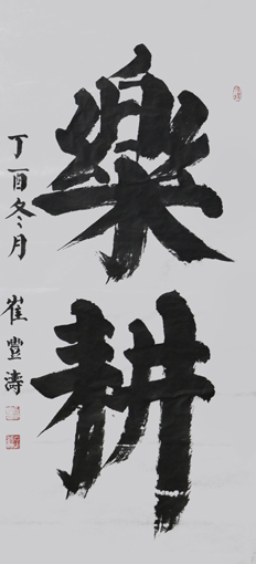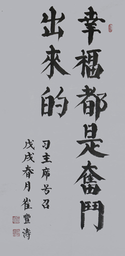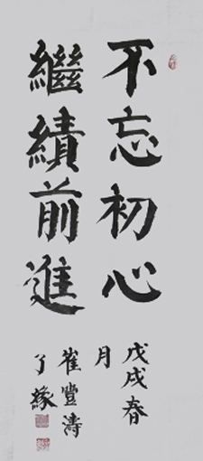 崔老师与书法结缘是从初中时开始的,在别的孩子戏闹顽皮时他却在练习书法,写生创意,临摹柳体、颜体已成了少时生活的一部分。2014年有幸结识了中国当代书画界泰斗张家雁老师,在张老师的指导教诲下书法有了很大的提高,崔丰涛每个星期都要到老师家中勤学苦练,恩师手把手一个字一个字从楷书基础练起,包括站姿,执笔都从学习古人开始,严格要求,老师说字如其人,人格做好,字必写的好。