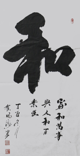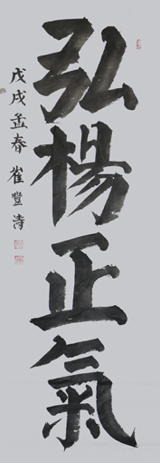 观崔老师作品,入眼便有一种古意悠悠的沉厚,他擅颜体。其书作皆呈现一种笔画丰满、结构正大、整体气势宏大,并有意识地将篆书笔法运用于楷,以正面视人,温柔敦厚、雄强茂密、浑厚刚劲。总之,用文字是无法表达崔丰涛作品韵致之万一,若细细品味,足以使人流连忘返!若说笔墨当随时代,崔丰涛之作可称是在当今浮躁世界的艺术中送来的一股清流,像是一个梦,但完全可以梦想成真。在崔丰涛认为,这是一个时有奇迹发生的时代,珍惜光阴,随缘与良师益友游,吸纳天地自然风光之神韵,感受日月风雨雷电之神威,体察自己玲珑剔透之本心,手不释书、笔,吾不知时日之过也。大浪淘沙,光阴似箭,褒贬名利确实如浮云。他相信水滴石穿,相信积善成德是一定会神明自得的! 如今崔老师已经有了自己的入室弟子,并且每周六日都到当地的艺术学校进行书法教学。