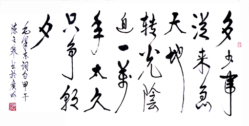 行书《毛泽东词·多少事 》规格:72x132cm释文:多少事,从来急,天地转,光阴迫,一万年太久,只争朝夕。