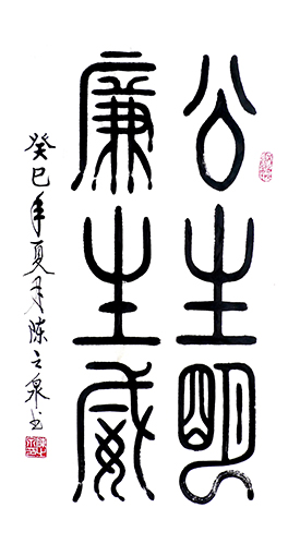 篆书《公生明 廉生威》规格:68x132cm 释文:吏不畏吾严而畏吾廉,民不服吾能而服吾公;廉则吏不敢慢,公则民不敢欺;公生明,廉生威。