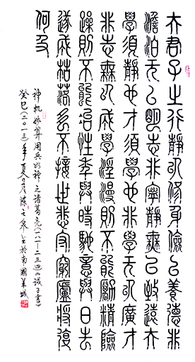 篆书《诸葛亮·诫子书》规格:68x132cm 释文:夫君子之行,静以修身,俭以养德。非淡泊无以明志,非宁静无以致远。夫学须静也,才须学也,非学无以广才,非志无以成学。淫慢则不能励精,险躁则不能治性。年与时驰,意与日去,遂成枯落,多不接世,悲守穷庐,将复何及!