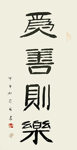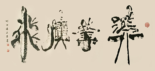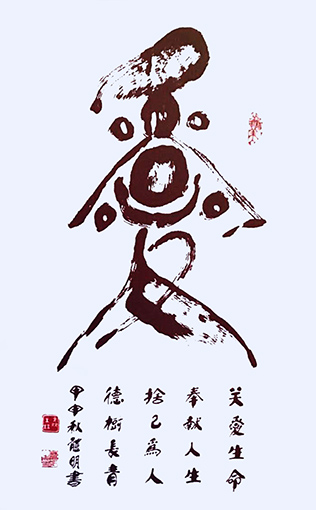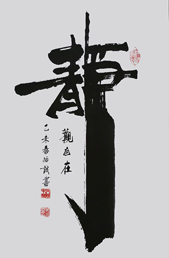 创作理论:本书法艺术是在《柳公权·玄秘塔》的基础上长期创作的同时吸收众家神韵、气息,如:粗与细、大与小、白与黑、有与无、阴与阳、相生相克的运转规律为定律基础,进而超脱进化,由粗俗转为高雅,或是由黑暗走向光明,也是由愚昧化为智慧,由野蛮走向文明的至高点,它的自然过程,既是以墨法气韵达到光华丽神、体透玲珑,大者尽含无为之太虚,虚实相应。非真非假,亦假亦真。一阴一阳,阴阳平衡。具真、具善、具美。具有无为之精神,具天地人之神灵,守真常变而不变,达元常而自立。具上上智之真气与元神合会,入於笔墨,至立神化真品。之所谓前人云之上品“画到极处方似字,字到极处方似画”,大者见雄魄之气概,细者入微妙见精神,其义理具足过去、现在、未来,而又非古非今,妙中非声非色,如斯自智智明,神灵自开自化,自起自落,方能成就无上之真谛。故此作品能开启人生之智慧,澄清心性之昏浊,如是有至诚观思念此作品者,能提神志、得轻安、息焦燥、德静益等之功效。
