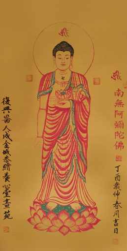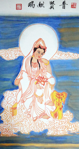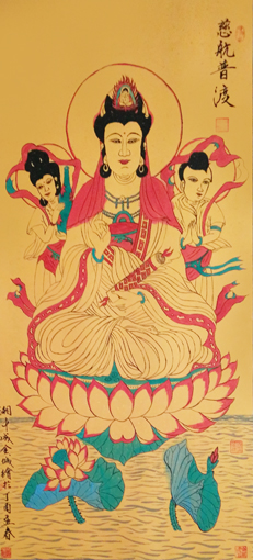 成金城的观音菩萨画,简洁古朴,端庄俊秀,富丽高贵,造型严谨;有一种发自内心的虔诚与崇拜。 在中国文化中,观世音菩萨是苦难众生的救渡者,其法力无边,以大慈大悲救济众生为本愿。 当众生遇难诵念其名号,菩萨实时观其音声前往救渡。 成金城笔下的观世音菩萨,在波涛汹涌的南海之上,红色莲花竞向开放,在莲花宝座上,观世音手持甘露指法,正静听苦难众生的芸芸之音,两位童子一双手合十,一手持玉净瓶,在金色佛光的映衬下,显得庄严神圣。 观世音法象圆满端庄,慈悲祥瑞,在柔美的线条中,红色点缀其中,使画面更显和谐亲切。