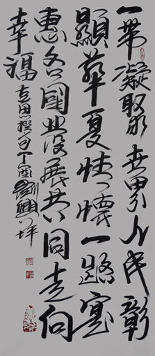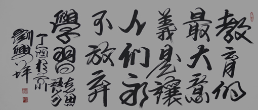 刘兴坪先生作为爱国英才,以卓越艺术家和优秀的社会活动家的崇高精神、强烈责任感和博大胸怀,认真贯彻执行党和政府的大政方针,遵循“百花齐放、推陈出新”的文艺方针,投身于书法艺术事业,长期从事书法艺术研究、创作和推广,“因义生情,由情赋形”,书法艺术造诣高深,臻于炉火纯青的境界,在我国书法艺术领域独树一帜,蜚声海内外,树立起成功人士事业的丰碑。先生坚持“优秀艺术服务于人民”,笔走龙蛇,仁风广布,弘扬优秀的中华文明,为社会主义现代化建设提供精神动力,为人民群众提供优秀的精神食粮,赢得良好的社会声誉,建立起艺术家辉煌的信誉大厦。刘兴坪先生的名字和爱国报国宣言以将与万里长城“爱国功德榜”长存,流芳百代,激励亿万华夏子孙为祖国繁荣富强而奋斗,先生为本人家族赢得了至高无上的荣誉,受到族人爱戴。