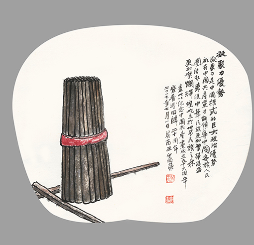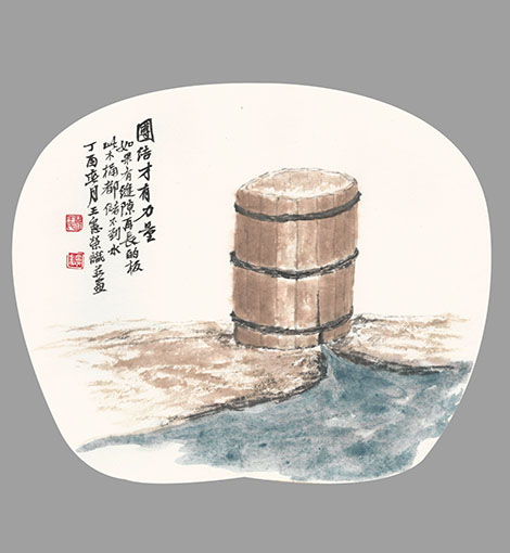 团结才有力量 如果有缝隙,再长的板,此木桶都储不倒水。 丁酉春月 王宪荣 识并画